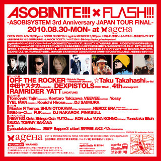 ageHa唯一のウィークデイモンスターパーティー”ASOBINITE!!!”をオーガナイズし、新たなる”アソビ”を追求・発信し続ける、ASOBISYSTEMが3周年を迎えた。それを記念しcapsuleの中田ヤスタカが主催する「FLASH!!!」と手を組み北海道から九州まで日本列島を縦断する「ASOBINITE!!!×FLASH!!!」全国TOURを現在展開中だが、そのFINALは本拠地ageHaで開催される。ASOBNITE!!!の真骨頂である月曜日の夜を彩るラインアップはOFF THE ROCKER、中田ヤスタカ [capsule]、DEXPISTOLS、4th、RAMRIDERを筆頭とするTOUR F