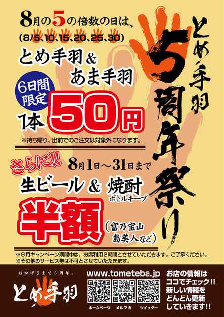 この暑い夏を、いかかがお過ごしでしょうか? やっぱりキンキンの生ビールと熱々ジューシーなとめ手羽ですよね この8月でとめ手羽は創業5周年を迎えます。 と、いうわけで、、、 8月、つまりは今日から真夏の大感謝イベント始まりますよ 8月の5の倍数日、、とめ手羽一本50円!!!!!!!!!!! 一ヶ月通して、生ビールと焼酎キープが半額!!!!! 皆様に愛されたおかげで、5周年を迎えることができました。 これからも、とめ手羽中央橋店をどうぞよろしくお願いします。 皆様にお会い