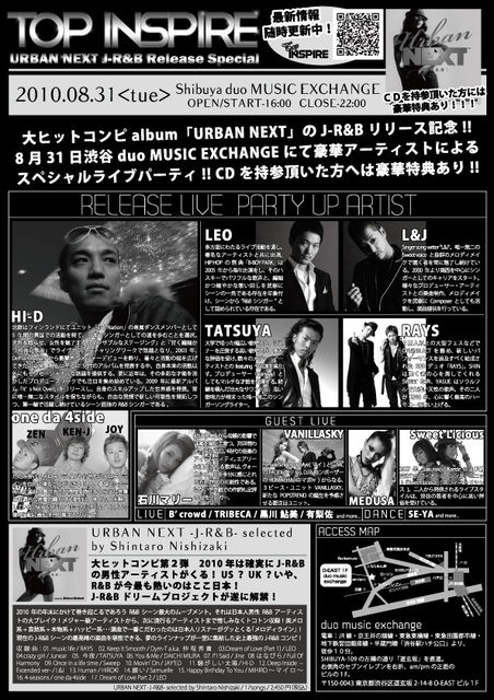 管理人様 貴重なスペース失礼します!! メッセージにてチケット、質問等お問い合せください 8月31日ビッグイベント開催決定!! 【イベント名】 TOP INSPIRE~URBAN NEXT J-R&B Release Special~ HMV渋谷カリスマR&Bバイヤー西崎信太郎監修!! 大ヒットコンピ第2弾 2010年は確実にJ-R&Bの男性アーティストが来る! US? UK? いやR&Bが今最も熱いのはここ日本! J-R&B ドリームプロジェクトが遂に解禁! 豪華出演者による魅惑のリリース記念イベント! 【主催】 株式会社ユニーク/duo MUSIC EXCHANGE 【企画