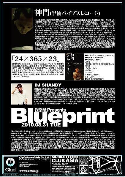 8月31日、火曜日! 渋谷 Glad (VUENOS 2F, 旧asiaP)で開催の要注目パーティのお知らせです!! 『Blueprint』と題したこのイベント!! Guestライブにはこの度ライブDVD「24×365×23」をリリースした神門from神戸が満を持してリリースライブを行います!! そしてGuest DJには渋谷を中心に大活躍中のDJ Shandyが登場!! このイベント、通常2500円かかってしまうところ、 僕にメッセージ頂ければ、 特別ディスカウント!! 1500円1ドリンク付きでご入場頂けます^^ 『火曜日グラッドゲスト希望』とタイトルに記入し、