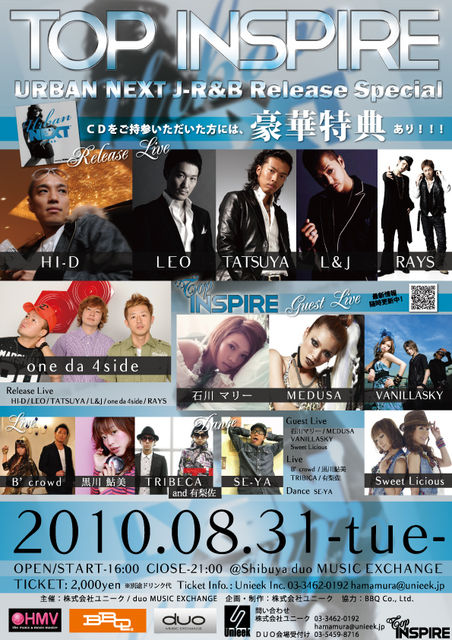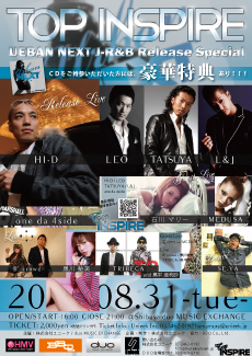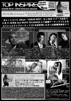 Shibuya duo MUSIC EXCHANGEにて超豪華イベント!! HI-D,LEO,L&J他豪華アーティスト勢揃い コンピレーションアルバムのリリースパーティーとの豪華コラボ★ 【イベント名】 TOP INSPIRE~URBAN NEXT J-R&B Release Special~ ■大ヒットコンピ第2弾 2010年は確実にJ-R&Bの男性アーティストが来る! US? UK? いやR&Bが今最も熱いのはここ日本! J-R&B ドリームプロジェクトが遂に解禁! 豪華出演者による魅惑のリリース記念イベント! 【主催】 株式会社ユニーク/duo MUSIC EXCHANGE 【企画・制作】 株式会社ユニーク