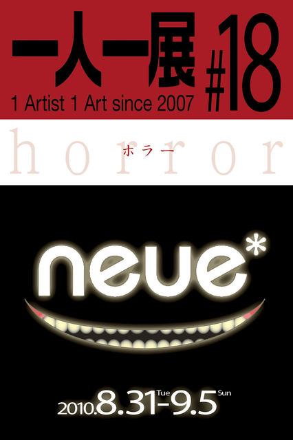 第18回一人一展の募集のお知らせです 今回のテーマは”ホラー” 〜〜〜〜〜〜〜〜〜〜〜〜〜〜〜〜〜〜 一般にホラーといわれているものは、 観る者が恐怖感を味わって楽しむことを想定して 制作されている映画や小説などの娯楽作品をいいます。 そんな身の毛もよだつこわ〜い作品大募集!! 残暑のきびしい夏の夜、 “ホラー”な作品で neue*がちょっと涼しい空間に、、、 〜〜〜〜〜〜〜〜〜〜〜〜〜〜〜〜〜〜 一人一展とは? ギャラリーバーneue*で 2007年から定期的に行われている 作品審査無し、参