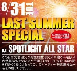 告知失礼致します。 8月31日(日)22:00〜渋谷キャメロットにて http://www.clubcamelot.jp/ 夏最後のHIP-HOP,R&BイベントSPOTLIGHT DJ'sが全員集合スペシャル DJ陣は 毎週火曜日を担当しているDJ TAKUMAと最年長のDJ SATORUを筆頭に 1週目からはMIU-G , TOMOHARU , SHINTARO 2週目はSHIN , SON-4, GUKI 3週目はTOKKO 4週目はNORIQUE , TOKU , WATAKEN from Peachfuljourney もちろん駆けつけDJも有り!? この日は火曜日DJが総集結!! 一夜限りの祭典!! 何が起きるか予測不能の一夜!? 2010年の夏