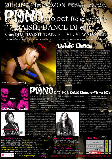 ¡Ú PARTY ¡Û : "PIANO project." Release Party -DAISHI DANCE DJ edit- ¡Ú DATE ¡Û : 2010 09 24 Friday ¡Ú PLACE ¡Û : OZON ¡Ú ADDRESS ¡Û : ̾¸Å²°»ÔÃæ¶è±É3-32-6 BECOME SAKAE 5F ¡Ú CALL ¡Û : 052-242-0780 ¡Ú WEB ¡Û: http://www.ozon-sp.com ¡Ú OPEN ¡Û : 21:00¡Á01:00 ¡Ú CHARGE ¡Û¡§Á°Çä¤ê. 2,500±ß / ÅöÆü. 3,000±ß (¶¦¤ËÊÌÅӥɥê¥ó¥¯Âå¤È¤·¤Æ500±ßɬÍ×) ¡Ú Guest DJ ¡Û DAISHI DANCE (http://www.daishidance.jp/) ¡Ú VJ ¡Û VJ WADAKEN (http://www.vjwadaken.com) ¡Ú DJs ¡Û Hisanori H ¡Ú Ticket Purchase ¡Û ¥¤¡¼