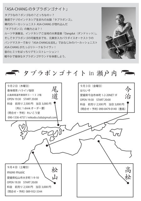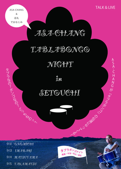 ASA-CHANGがやってくるよー! 元東京スカパラダイスオーケストラのバンマスで、 ASA-CHANG&巡礼でもおなじみのパーカッショニスト。 音楽もパーソナリティも最高ですよ。 詳しくはこちらを↓ http://www.asa-chang.com/ 今回はASA-CHANGがずっと演奏してきた 『タブラボンゴ』という楽器の魅力を 自ら伝導にやってくるのです。 演奏とトーク、動画を使ってのレクチャーなど 合同勉強会のような、一風変わったおもしろーい時間になりますよー。 今回のタブラボンゴナイトは 瀬戸内をぐるりと回る感じで4カ所の開催です