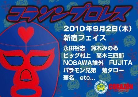 9月2日(木)「コラソンプロレス」 19:00試合開始 18:00開場 東京・新宿FACE ■メインコラソン〜コラソンvs新宿 永田裕志、田村和宏 VS 高木三四郎、入江茂弘 ■セミコラソン〜コラソンvs新宿 ビッグ村上 VS マッスル坂井 ■第3試合〜コラソンvs新宿 鈴木みのる VS 公募中 ■第2試合〜FC東京愚連隊再武装 NOSAWA論外、FUJITA VS バラモンシュウ、ケイ ■第1試合〜女子プロレスの為に菊タロー討伐!! 菊タロー VS 華名 ■チケット コラソンシート(1列目+記念Tシャツ)7,000円 残りわずか コラソンカウンター(人気