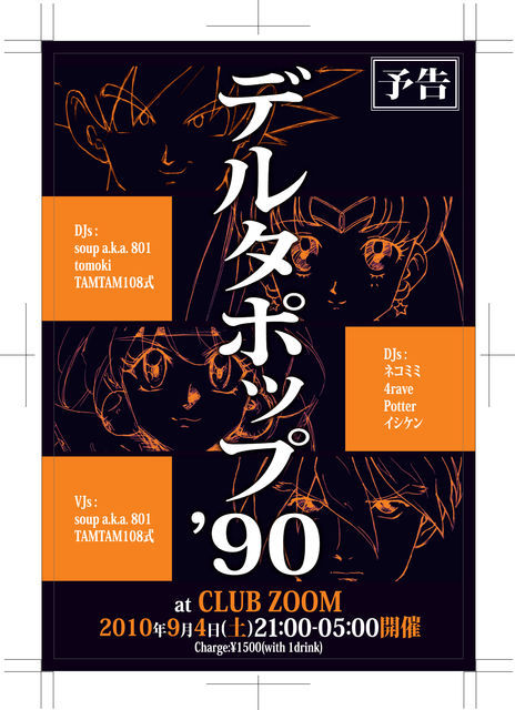 どーも、みなさんこんにちわ! 今度のデルタポップは90年代オンリーのパーティをやっちゃいます! 今まで沢山のスピンオフ企画をやりましたが、90年代が皆さんのリアルタイムにザクッっと胸に刺さるパティになること間違いなし! 普段は中々聴けない渋いあの曲も毎度お馴染みなキラーチューンまで余すところなくセレクトしていきます。スピンオフなのでレジデントだけじゃなくゲストDJも要チェックや!! デルタポップ'90 2010/9/4(土) at. ZOOM スタート 21:00- Charge \1500(with 1drink) DJs soup a.k.a. 801 / tomoki TAMTAM108