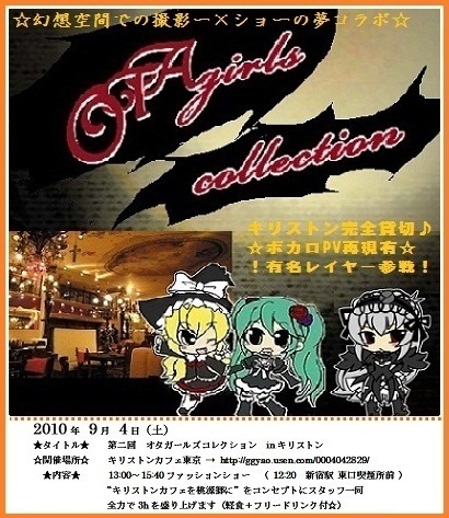 管理人様貴重なスペースお借り致しますm(_ _)m こんばんわ〜〜 OTAGIRLS COLLECTION主催のやる夫で御座います(^ω^) 前回一般参加者の二次会参戦率40%超のあの大人気イベントが さらにスケールアップして帰ってまいりました!! 第一回 http://mixi.jp/view_event.pl?id=54389353&comment_count=80&comm_id=122908 LOGまとめ http://mixi.jp/view_diary.pl?id=1536070679&owner_id=20471900 幻想的に 優美に 可憐に それだけを求めて 一般人では実現不可能といわれていたキリストンカフェ東京の貸切 成功