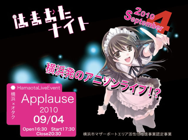 《公式HP》 http://hamaota.com/hamaota-night/ 《イベント名》 はまおたナイト 《日程》 2010年9月4日(土) 開場:16:30 開演:17:30 終了:20:30 《会場》 Applause (YOKOHAMA NEWS HARBOR) 横浜市中区太田町2-23 横浜メディアビジネスセンター1F みなとみらい線馬車道駅7番出口より徒歩5分 みなとみらい線日本大通駅より徒歩5分 JR関内駅北口より徒歩5分 横浜市営地下鉄関内駅より徒歩4分 《出演》 清水愛 喜多村英梨 ゾンビーズ メイドカフェ「Honey Honey」 メイド居酒屋「Fancycat」 東京都市大学