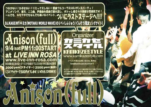 諸般の事情により今回をもちまして電波ソングナイト(増刊アニソンフルも含む)は活動を一時休止させていただきます。 2008年3月21日に新宿ロフトプラスワンにて産声を上げて以来、2年半もの長きにわたり活動を継続出来るとは夢にも思いませんでした。 これまで支持してくださった全ての参加者各位に厚く御礼申し上げます。 またいつかどこかで再開するその日まで、皆様どうかご無事でありますように。私共も必ず生きて還ってまいります。 アニメソングDJイベント、アニソン(Full)FINAL 開催します! つながない!かぶせない!リミ