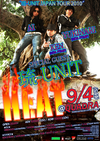 HEAT ★SPECIAL GUEST★ 琉−UNIT KEN (元DA PUMP) YUKlNARI (元DA PUMP) AI 9/4(SAT) at QUADRA OPEN 21:00- ADV\2500(1Dr)200枚限定 ADM\3000(1Dr) ※当日、受付での前売入場は一切出来ません! アーティストの都合上、入場制限があり、チケットが完売した際には、当日入場が出来ませんので、チケットの購入は、お早めに! ★DJ★ HIROKAZU(JAZZNATION) TAROW(JAZZNATION) YOUSKE(JAZZNATION) M,n,M(ENVY) TADASHI(CONTROL) KYU-B(HIROSAKI) USK(CHERR BOYZ) ★DAN