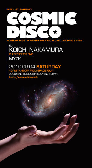 こんにちわDJのコーイチです。 青森でハズレのないパーティーとしてしっかりと定着してきたCOSMIC DISCO ローカルのレジデントDJとサポーターによって育まれているこのパーティーは 既存にない独自のダンスミュージックカルチャーを作り出し、青森から全国へと逆発信していきます。 良い音、良い音楽で踊ることの楽しさを是非体感しにきて下さい! *WEBに前回の写真と音楽、動画をUPしましたので、 興味があれば覗いてみて下さい。 http://cosmicdisco.net Get Discount(特別御優待券プレゼント)!! お名前(フルネーム)をカ