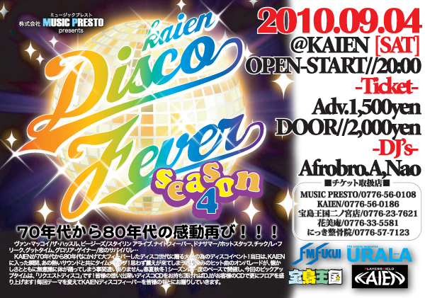 告知失礼致します。 ◆1シーズンに1度KAIEN Disco Fever! よみがえる80'sのディスコフィーバー 老若男女の社交の場としても解放されます。 ☆70年代から80年代の感動を再び!!!☆ アース・ウィンド&ファイヤー/セプテンバー、宇宙のファンタジー、シェリルリン/ ガット・トゥ・ビー・リアル、ボーイズ・タウン・ギャング/君の瞳に恋してる・・・ KAIENが70年代〜80年代にかけて大フィーバーしたディスコ世代に贈る大人の ためのディスコイベント!!!KAIENに入った瞬間、あの熱いサウンドとともにタイム