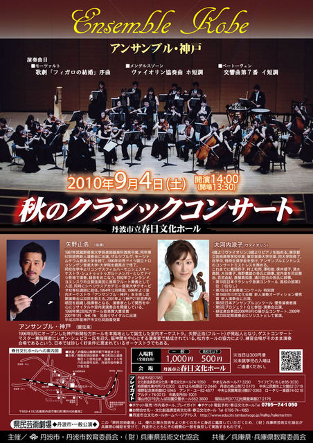 管理人様、丹波市のイベントですが告知させてください。 高校生以下はワンコインで鑑賞できます!! 堅苦しくならず、気軽にオーケストラを聴いてみませんか? と き 9月4日(土)14:00開演 13:30開場 と こ ろ 春日文化ホール ※兵庫県丹波市春日町黒井496番地2 (丹波市役所春日庁舎と同じ敷地内です) 主な出演者 アンサンブル・神戸(神戸新聞松方ホールを拠点として誕生した室内オーケストラ) 指揮:矢野正浩、V
