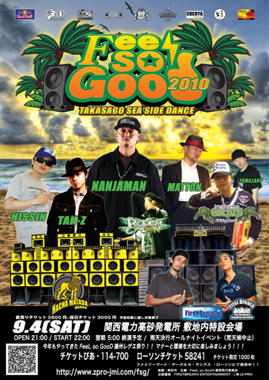 1998年頃から兵庫県高砂市で毎年行われている シーサイド野外ダンス!! FeeL so GooD[高砂電発野外ダンス] 兵庫県高砂市で行われる歴史あるオールナイト野外サウンドシステム 関西電力高砂発電所 敷地内特設会場 兵庫県高砂市梅井6-4-1 2010年 9月4日開催!! **** 好評発売中**** 前売り券:2500円 当日券:3000円 【チケットぴあ】 Pコード 114-700 【ローソン】 Lコード 45748 SOUND OASIS RISING SOUND RODEM CYCLONE HACNAMATADA with Sound System FI