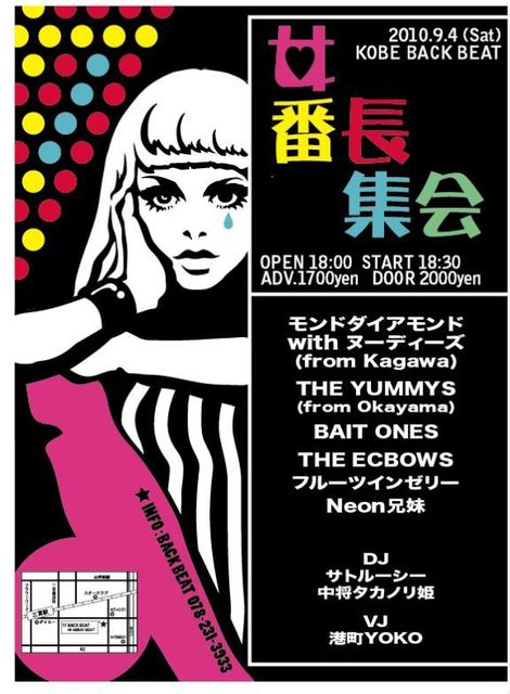 エクボーズ、今回も「女番長集会」に参戦します!!。神戸ではひさしぶりに4人エクボーズかな〜?。 出番は最後です!!。よろしくお願いします!!。 「女番長集会」 9月4日(土)神戸バックビート OPEN:18:00 START 18:30 前売り1700円 当日2000円 出演BAND モンドダイアモンド with ヌーディーズ(香川) THE YUMMYS(岡山) BAIT ONES THE ECBOWS フルーツインゼリー Neon兄妹 DJ サトルーシー 中将タカノリ姫 VJ 港町YOKO