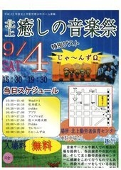 平成22年度北上市勤労青少年ホーム事業 北上 癒しの音楽祭 日時:2010年9月4日(土) 15:30〜19:30 場所:北上市幸町/北上勤労者体育センター ※駐車場はありませんので公共機関やお近くの有料駐車場をご利用下さい。 入場無料 出演: Wm5+1 松本直人 yukko アプリ アップロォZ 佐々木皓太朗 Pokke 佐々木由香利 特別ゲスト: じゃ〜んずΩ 音楽サークルや個人での発表の場を提供し、各出演者や市民の交流、そして北上勤労者体育センターに感謝をこめて行うものでもあり、普段スポーツをしている市民に音楽を聴いて気分転換