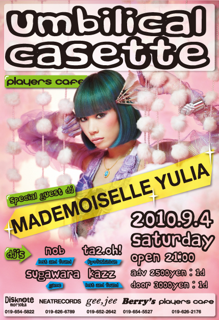 管理人様、参加者の皆様、イベント告知失礼します。 東北は岩手県盛岡市にてMADEMOISELLE YULIAさんをゲストDJとしてお迎えし、スペシャルなイベントが開催されますので盛岡はもちろん、近県にお住まいの方も是非是非遊びにいらしてください!! umbilical casette 2010/09/04(sat) @players cafe guest dj MADEMOISELLE YULIA [profile] 2008年、デビューミックスアルバム"NEON SPREAD"をリリース。オリジナルでマルチレイヤーな世界観を表現し、一躍TOKYO ELECTROアイコンとしての名を恣にする。近年は、シンガーとしての活