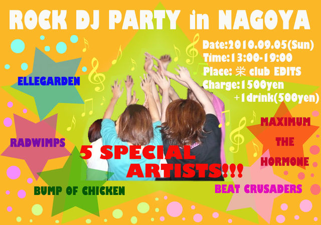 *****8月23日更新******************************************** 時間微妙に変更あります!! ■日時:2010年9月5日(日) 12:00-18:00 ≪開場:12:00 開演:12:30≫ 開場・開演時間は変更なしです(^ω^) 終わる時間が30分早くなりました! DJ自体は17:30までで、そのあと集合写真撮ったりする予定です* 時間が早くなって、9/5の夜ライブ予定ある人も 参加しやすくなったかも?!^^ また何か変更あればupさせてもらいます* *****8月20日更新******************************************** こんにちは!!