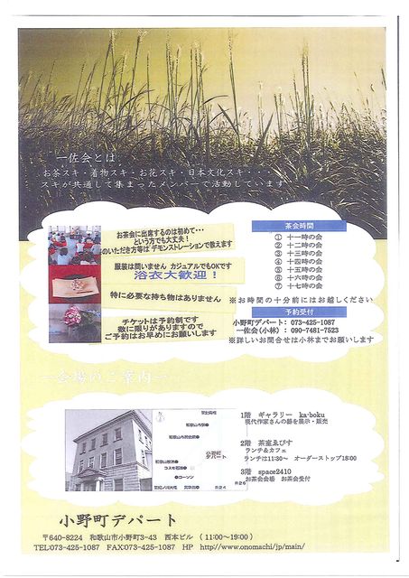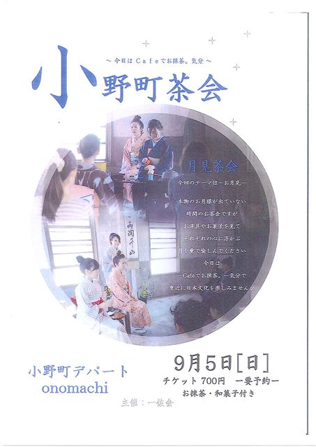 管理人様、告知失礼いたします。 第2回小野町茶会を開催いたします。 今回は「お月見」をテーマに季節を楽しみましょう☆ お月様のまだ出ていない時間のお茶会ですが、お道具の取り合わせや和菓子から心に浮かぶお月様を楽しんでいただきたいと思っています。 前回と同じく、小野町デパート3階です。茶道の経験がなくても、今回もお茶のいただき方のデモンストレーションを行いますし、ジーンズでも着物でも大丈夫ですので、どうぞお気軽に日本文化を楽しみにきてください☆ ちなみに主催側は、今回浴衣を着ますので、浴衣大歓迎です