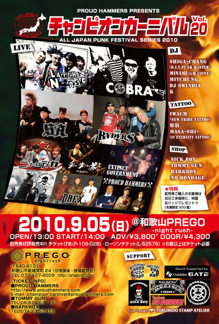 あらま〜 ☆2010.9.05(日) PROUD HAMMERS PRESENTS 『CHAMPION CARNIVAL VOL.20 〜ALL JAPAN PUNK FESTIVAL SERIES 2010〜』 @和歌山PREGO -night rush- OPEN/13:00 START/14:00 ADV/\3800 DOOR/\4300(D別) -BAND- ■LAUGHIN'NOSE □COBRA ■SA □THE RYDERS ■ニューロティカ □壬生狼 ■EXTINCT GOVERNMENT □COCKNEY COCKS ■DREX □PROUD HAMMERS -DJ- ■SHIGA-CHANG(D.I.Y.PUNK MASTER) □MINAMI(反権力ZINE) ■MITCHUNG □DJ SWINDLE ■K -TATTOO- ■IWACH(NEW TRIBE TATTOO)