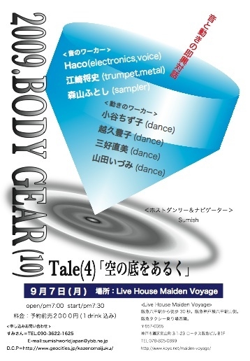 〜音と動きの即興対話/Body Gear(10)〜 Tale-4/空の底をあるく ●9月7日 (月) 開場 19:00 開演 19時30分 出演: Dancers:小谷ちず子+ 越久豊子+ 三好直美+ 山田いづみ Musicians:江崎将史 (trumpet, others) + 森山ふとし (sampler) + Haco (electronics,voice) Host & navigator:角正之 (Masayuki Sumi) 会場:Maiden Voyage (阪急六甲、神戸) 神戸市灘区宮山町3−1−23 ロータス阪急ビルB1F アクセス:阪急六甲駅から徒歩30秒阪急六甲駅山側阪急タクシー乗り場西隣 TEL:078-805-0899 http://www.koyo.net/maiden-voyage
