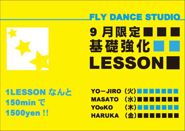 おはようございます!FLY DANCE STUDIOです! 皆さん2010年の夏を思いっきり楽しんでおられるでしょうか? 短い夏なので、仕事も遊びも密度を濃く両立していきたいものですね さて、FLY DANCE STUDIOより告知がございます。 それは・・・・・・・・・ 9月限定「基礎強化LESSON」を開催します 名前の通り、アップ、ダウン、アイソレーション、リズムトレーニング等のダンスに必要な基礎部分を練習するという内容です。 1レッスンが2時間半とたっぷりあるのでこの機会に基礎をみっちり叩き込みましょう