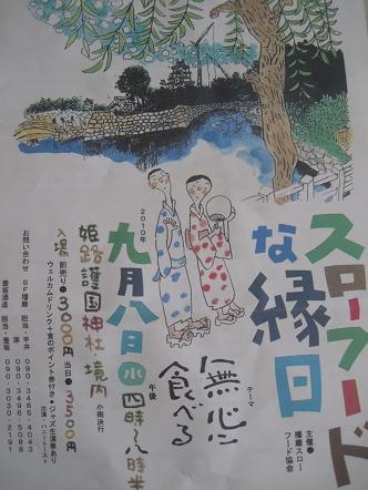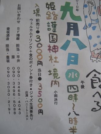 今年も開催スローフードな縁日 回を重ねるごとにお客さんの数がどんどん増え、大盛況です 各店舗が多彩な出し物で縁日を盛り上げます(写真2参照) 3000〜3500円って、ちょっと高いように感じますが、いろんなお店の売り物をおなかいっぱい楽しめて満足できます 古本市や今年初のジャズライブもあります 縁日はちょっと薄暗くなり始める夕方の4時から境内の照明がいい雰囲気になる8時半まで ちょっと美味しいもんをちょこちょこっとつまみながら、一緒に色々なお酒も