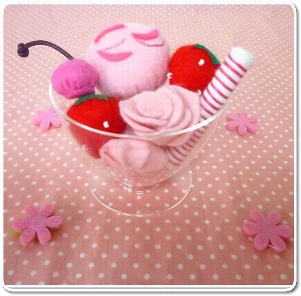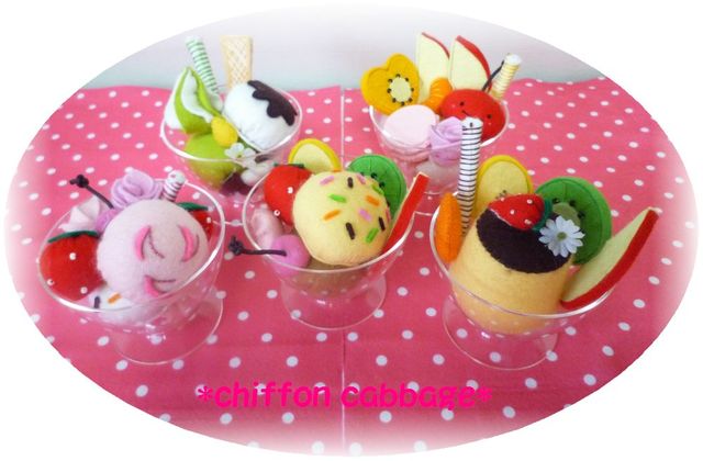 9/8 10時〜12時 受講料:1500円 材料費:800円(カット済みフェルト、テキスト、パフェカップ付き) 託児料:無料!(要予約) chiffon cabbageオリジナルのミニパフェから今回はいちごパフェを作っていきます。 カット済みのキットを使ってアイス・いちご・ホイップクリームなどを作ったり、ボンドではったりします、出来上がったら自由にトッピングして下さいね☆ 初心者の方も安心、分かりやすいテキスト付きです♪思わず食べたくなるようないちごパフェ、インテリアとして飾っても可愛いし、お子さまのおままごとにも喜ばれ