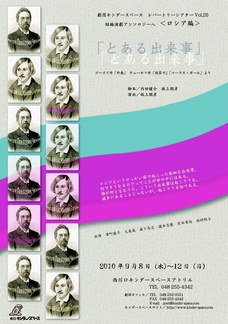劇団キンダースペース公演 『とある出来事』 ゴーゴリ作「外套」チェーホフ作「別荘で」「コーラスガール」より 脚本/内田健介 坂上朋彦 演出/坂上朋彦 9月8日(水)〜12日(日) 会場:西川口キンダースペースアトリエ 前売券 3000円〈当日券 3300円〉 ペア券 5500円(お二人でご入場の方) 養成所割引券 2500円(大学・専門学校・演劇養成所生徒対象) 学生割引券 1500円 ゴーゴリの外套がメインですが チェーホフの短編、別荘で、コーラスガールも同時上演いたします。 詳細は以下にて http://www.kinder-spac