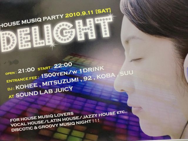 告知失礼します。 今週です! HOUSE MUSIQ PARTY DELIGHT 2010.9.11(SAT) @sound lab JUICY OPEN:21:00 START:22:00 ENTRANCE FEE 1500YEN/W 1DRINK DJ:KOHEE.MITSUZUMI.92.KOBA.SUU FOR HOUSE MUSIQ LOVERS VOCAL HOUSE/LATIN HOUSE/JAZZY HOUSE etc... DISCOTIC&GROOVY MUSIQ NIGHT!!! sound lab JUICY 福山市元町13-8 084-926-8821 http://mixi.jp/view_community.pl?id=2254639 よろしくお願いします〜