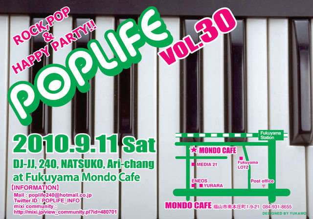 管理人様失礼いたします。 福山でのイベントですが、いつも岡山/倉敷方面の方にも多く参加していただいていますので、告知させて下さい。 まだまだ残暑がキツイですね 今年は、どこのフェス行きましたか? 僕は、フジロックだけをピンポイントで楽しんできました。 夏フェスシーズンが終わったので、 続いては、DJパーティーPOPLIFEで音を楽しんでみませんか? いつもの通り、ノーチャージ、入場無料ですのでお気軽に 今回は、なんと30回目となります もう5年もやってます。5周年ということで、 ライブイベ