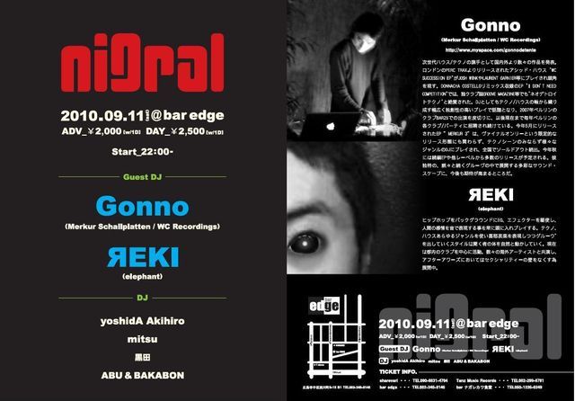 管理人さま、告知失礼致します! "nigral" 09.11 (Sat) start 22:00〜 @ bar edge, hiroshima ADV \2,000(w/1d) Door \2,500(w/1d) Guest DJ: Gonno (Merkur Schallplatten/WC Recordings) Яeki (elephant) DJ: ABU & BAKABON 黒田 mitsu yoshidAAkihiro ●Gonno● 次世代ハウス/テクノの旗手として国内外より数々の作品を発表。 ロンドンのPERC TRAXよりリリースされたアシッド・ハウス"WC SUCCESS EP"がJOSH WINKやLAURENT GARNIER等にプレイされ頭角を現す。DONNACHA COSTELLOリミックス収録