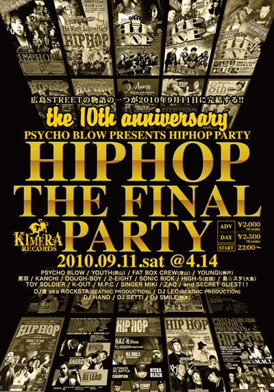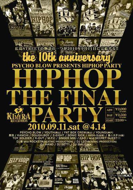 『HIP HOP 10th ANIVERSARY & FINAL PARTY』 2010年9月11日 会場 CLUB4・14 (東急ハンズ向かいの地下2階) 前売り2000円(1D ORDER) 当日 2500円(1D ORDER) ◆出演者◆ PSYCHO BLOW YOUTH(岡山) FAT BOX CREW(津山) YOUNGI(神戸) DOUGH-BOY 2-EIGHT SONIC RICK HIGH-5(岩国) 黒羽 KANCHI 島☆スタ(大島) TOY SOLDIER K-OUT M.P.C SINGER MIKI ZAO ◆DJ ◆ 道 aka ROCKSTA(BEATNIC PRODUCTION) LEO(BEATNIC PRODUCTION) HAND SETTI and SECRET GUEST!! 『MIKIの前売りで』と言っても