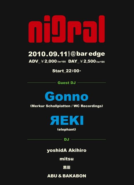 管理人さま、告知失礼致します。 "nigral" 09.11 (Sat) start 22:00〜 @ bar edge, hiroshima ADV \2,000(w/1d) Door \2,500(w/1d) Guest DJ: Gonno (Merkur Schallplatten/WC Recordings) Яeki (elephant) DJ: ABU & BAKABON 黒田 mitsu yoshidAAkihiro ●Gonno● 次世代ハウス/テクノの旗手として国内外より数々の作品を発表。 ロンドンのPERC TRAXよりリリースされたアシッド・ハウス"WC SUCCESS EP"がJOSH WINKやLAURENT GARNIER等にプレイされ頭角を現す。DONNACHA COSTELLOリミックス収