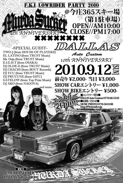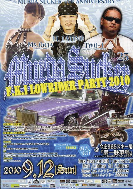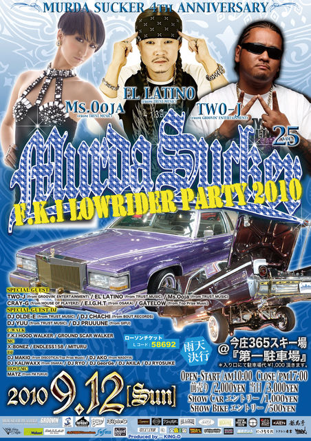 F.K.I LOWRIDER PARTY 2010 MURDA SUCKER vol.25 〜4th ANNIVERSARY〜 2010/09/12(SUN) @今庄365スキー場『第一駐車場』 OPEN-START/AM10:00 CLOSE/PM17:00 ※雨天決行 -Ticket- 前売り/2,000yen 当日/3,000yen ローソンチケット/Lコード:58692 SHOW CAR エントリー 1,000yen (9/5以降2,000yen) SHOW BIKE エントリー 500yen (9/5以降1,000yen) ■SPECIAL GUEST■ TWO-J (from GROOVIN' ENTERTAINMENT) EL LATINO (from TRUST MUSIC) Ms.Ooja (from TRUST MUSIC) CRAY-G (from HOUSE OF PLAYERZ) E.I.G.H.T (fr