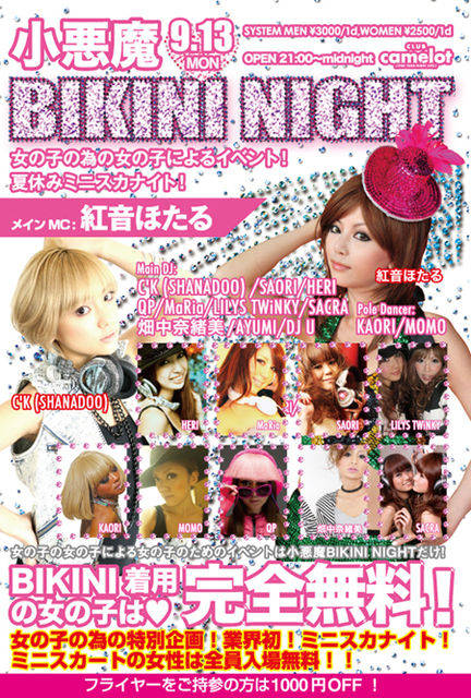 管理人様告知失礼致します 9月13日(月曜日) 渋谷のクラブcamelotで小悪魔ビキニナイトが開催されます 女の子の為の女の子によるイベント (男性ももちろん参加可能) 毎回500人を超え3月は800人 基本毎月第2月曜日開催 今回はビキニとミニスカスペシャル ビキニ着用の女の子は入場無料 ミニスカ着用の女の子も入場無料 セクシータレントの紅音ほたるがメインMCに登場 パフォーマンスに釘付け必至です このイベントでは 紅音ほたるが掲