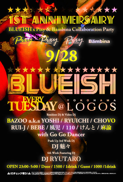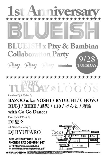 管理人様告知失礼致します。 〜EVERY TUESDAY〜 『BLUEISH』 @YOKOHAMA LOGOS OPEN/23:00-5:00 DOOR/1500/1D GUEST/1000/1D DJ&VJ BAZOO a.k.a YOSHI RYUICHI RUI-J CHOVO BEBE 風児 110 けんと 麻論 3rd Week Push Up DJ DJ 魅々 4th Week Feat DJ DJ RYUTARO HIP-HOP & ALL GOOD MUSIC!! 横浜LOGOSにて毎週火曜日を盛り上げているBLUEISH! VIDEO SLを導入したPARTY STYLEなのでDJが流している曲のPVを見ながら楽しむ事 が出来ます! (VIDEO SLは一晩の中で1h~2h程度です