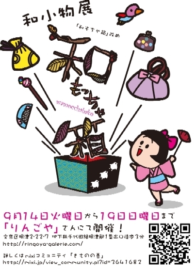 和小物展(和もちゃ箱改メ)「和もっちゃ箱」vol.2開催します! 日 時:9月14日(火)〜19日(日) 14日 14時〜19時 15.16.17.18日 12時〜19時 19日 17時まで 場 所:〒113−0031 東京都文京区根津2−22−7 りんごや 東京メトロ千代田線根津駅 1番出口より徒歩3分 http://ringoya-galerie.com/ringoya.html 5月に開催した「和もち