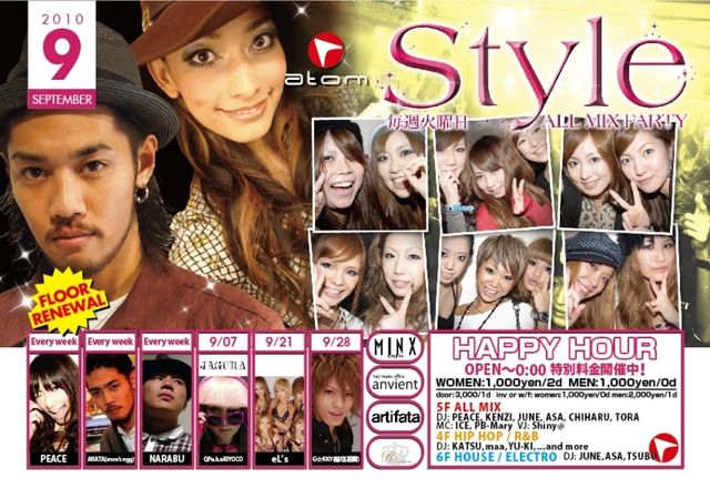 管理人様告知失礼します メッセージ等いただければ特別に、 女性\1000/1D, 男性\1000/NoDのディスカウントゲストをお取りすることが出来ます もしかしたら来れないかもという方でもゲストお取りできますので気軽にメッセージお願いします ♪ 連絡がとれない場合などは 「ナオキ」のゲストで「ナオキ」と言えば入れます 毎週火曜日ATOMにて開催しているオールジャンルをフルに楽しめて、満足度120%の大人気、超盛り上がりイベント 「STYLE」です!!! ロシアンテキーラ、肉巻きおにぎり、ブランド