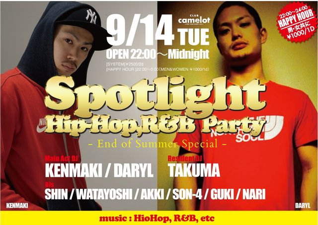 告知失礼します。 9/14(火) 22:00-5:00 -HipHop, R&B Party- 『SPOTLIGHT -End of Summer Special-』 @Camelot 『SPOTLIGHT』とは...? ◆平日火曜にも関わらず毎回400名近くのお客様で盛り上がっているHipHop, R&B Partyです。 ◆ゲストのお客様は、終日男性1000円/1Drink、女性1000円/2Drink、というお得 な価格でご入場出来ます。 ■今回の2週目SPOTLIGHTのMain Act DJは... ●六本木FLOWER土曜日や六本木CRUNK木曜日、西麻布a-life水曜日など都内数々のBig Partyにレギュラー出演している『DJ KENMAKI』 ●渋谷HARLEM火