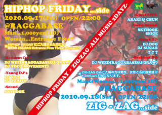 HIP HOP FRIDAY X ZIG ZAG -ALL MUSIC 2DAYZ- ■HIP HOP FRIDAY SIDE 9/17(FRI) ■ZIG ZAG SIDE 9/18(SAT) ■OPEN/22:00- TILL MORNING!! ■1000YEN/1D ※9/17のHIP HOP FRIDAYにご入場された方には、翌日のZIG ZAG ENTRANCE FREE TICKETをプレゼント! ※9/18のZIG ZAGのみ、ご入場の方は通常通り1000YEN/1Dになります。 -HIP HOP FRIDAY SIDE- ■RESIDENT DJ's WEED.YOCO ■Young DJ's KAZ.TOMITY ■SOUND SKYHOOK -ZIG ZAG SIDE- ■RESIDENT DJ WEED ■GUEST DJ A-KEN.DOG.SUGAR ■GUEST SOUND SHIGE FROM 自然防衛軍 ■GUEST LI