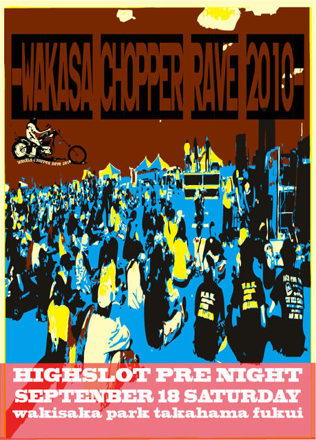 この度イベント名を変更しました 「MOTORCYCLE & ROC’K HIGHSLOT」から 「WAKASA CHOPPERS DAY “HIGHSLOT”」 に改名しても気持ち変わらず若狭のCHOPPERシーン を盛り上げて行きたいと思います。 2010.9.19(sun) FUKUI @TAKAHAMA WAKISAKA PARK am11:00 open ¥500/1DRINK&Sticker [Booth] Pinstriper Apparel Foods [Event] Bike Contest Bingo etc 脇坂公園:福井県大飯郡高浜町西三松 http://motor.geocities.jp/jackrindow/highslot-4.html WAKASA CHOPPER RAVE 2010 htt