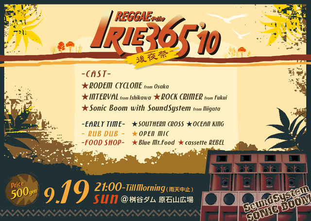 北陸最大級のレゲエフェス「アイリィサンロクゴ」2010年も開催! スキー場のゲレンデに響く天然リバーブ、 一流サウンドエンジニアによる「でかくて気持ちいい音」 地元名産おろしそばからジャマイカ料理など 食べ物は全て手作り「おいしくて優しいごはん」 最高の芝生の上で、ゴミは少なく地球に優しく 「はだしで遊べるレゲエフェス」 Danne The Records Presents "IRIE365 〜2010〜" 【開催日】 *2010年09月19日(日) 【開催場所】 *[会場] 今庄365スキー場 *[住所] 〒919-0128 福井県南条郡南越前町板取8