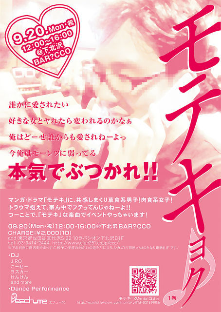 管理人さん、貴重なスペースをお借りします。 「モテキ」に触発されてイベントをやる事になりました。お時間のある方は是非遊びにいらして下さい。 http://mixi.jp/view_community.pl?id=5218960 マンガ・ドラマ「モテキ」に共感しまくり草食系男子!肉食系女子! 家ん中でふてってんじゃねーよ!! つーことで、「モテキ」な楽曲でイベントやっちゃいますw DT臭漂うフロアへようこそwww 「モテキョク♪」 日時:9/20(月・祝)12:00〜16:00 場所:下北沢 BAR? CCO 〒155-0032 東京都世田谷区代沢5-32-10ラパシオン