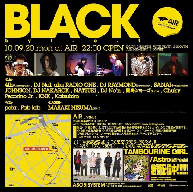 ディスカウント受け付けてます お気軽にメッセージください 平日だけど、みんな来ないと損しますよ。マジで。 本当に良い音で踊れるパーティーでっす! 中田ヤスタカ率いる“RED”と対をなすかたちで展開される“BLACK by t.o.t”。それは、より純粋な音楽志向のパーティとして、若い世代からの大きなリスペクトを獲得。AIRウィークデイを代表するキラーコンテンツの1 つとして成長してきた。レジデントを務めるのは、パンクロック、デジタルロック、テクノ、クリックといった音楽的バックボーンをもち、クラウドをフロアから