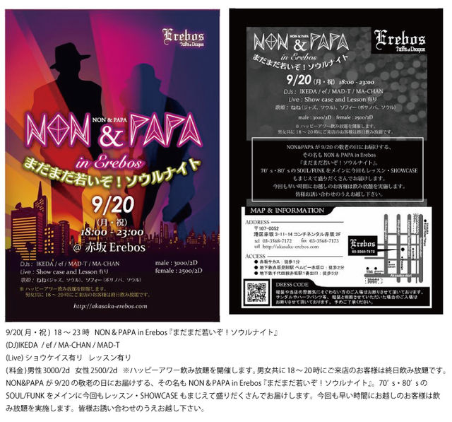 パパさんの日記でもアップされていますが、 赤坂エレボスにて 《NON&PAPA IN エレボス『まだまだ若いぞソウルNIGHT』》が 開催されます。 青山モーメンツで定期開催のイベントが 赤坂エレボスでも開催です。 普段水曜日に都合が悪い方、興味のある方、 休みでお時間の取れる方等、是非遊びに来て下さい 日時 9月20日(月曜日敬老の日祭日)です。 ※開催はちょっと早めの18:00〜23:00!! (早く踊って早く帰りましょう♪) 場所 赤坂エレボス 料金 女性 2,500円 男性 3,000円(2ドリンク) (20時までの