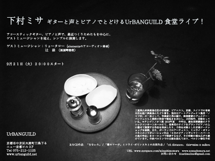 下村ミサ ギターと声とピアノでとどけるアバンギルド食堂ライブ! 9月21日(火)20:00スタート アコースティックギター、ピアノと声で、最近つくりためたもを中心に、 ゲストミュージシャンを迎え、シンプルに演奏します。 ゲストミュージシャン:リョータロー (elementsのアコーディオン奏者) 辻 崇 (馬頭琴奏者) 三重県出身淡路島在住の音楽家、ピアニスト。京都、スイスでの音楽生活を経て淡路島にたどり着き、現在はアートプロジェクト集団「ノマド村」の一員として、写真家の茂木綾子、映