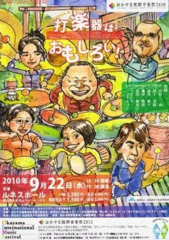 【会場】岡山・ルネスホール 岡山市北区内山下1-6-20 TEL:086-225-3003 URL:http://www.renaiss.or.jp/index.html 【出演】 中村功・池上英樹・前川典子・畑中明香・出井紗希子・マーティン・フリンク 【演奏予定曲目】 サンババトゥカーダ/中村功 リビングルームミュージック/ジョン・ケージ 6人の打楽器奏者のためのSMPG/リタ・トレス(日本初演) 机の音楽/ティエリー・ディ・メイ 火をお持ちですか?/エマニュエル・セジョルネ クラッシュミュージック/ニコラウス・A・フーバー Go To The Goal 5人の打楽器