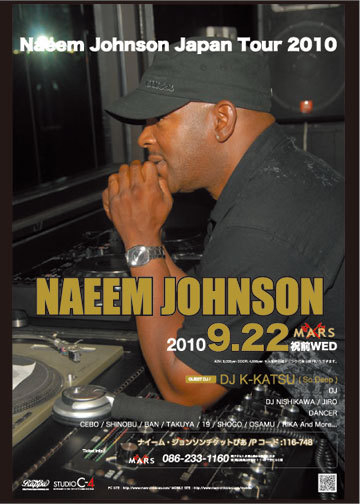 管理人様、告知失礼します。 2010.9.22 (WED) 祝前日 Naeem Jonson Japan Tour 2010 @MARS GENRE : HOUSE <SPECIAL GUEST DJ> ・Naeem Johnson (From New Jersey) <GUEST DJ> ・DJ K-Katsu (So Deep / T5C / Monday Channel) from Osaka <SUPPORT DJ> ・NISHIKAWA (So Deep OKYM) ・JIRO (Shake Your Body!!) <SUPPORT DANCER> CEBO / SHINOBU / BAN / TAKUYA / 19 /SHOUGO / OSAMU / RIKA and more... OPEN 21:00〜 ADV 3000YEN DOOR 4000YEN ※共に別途1DRINK必要です Pコード:116-748